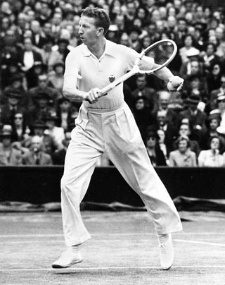 "An excellent all-surface player, Don Budge sky-rocketed to fame in the late 1930s by winning the US Open doubles in 1936. He took the world by storm in the next two years by winning an unprecedented 13 Grand Slams (6 singles, 3 doubles, and 4 mixed doubles). He won the singles, doubles and mixed doubles of Wimbledon and the singles and mixed doubles of the US Open in 1937. In 1938, he defended all these titles and added the US Open doubles crown to his list of conquests. But his real claim to fame that year was the Grand Slam- winning all the four major tournaments in the same year. In 1939, Budge turned professional and celebrated in style by winning two majors- the Wembley Championship and the French Pro Championship. In the years to come, war curtailed tennis in the world but Budge added two more titles to his bag- the 1940 and 1942 US Pro Championships."