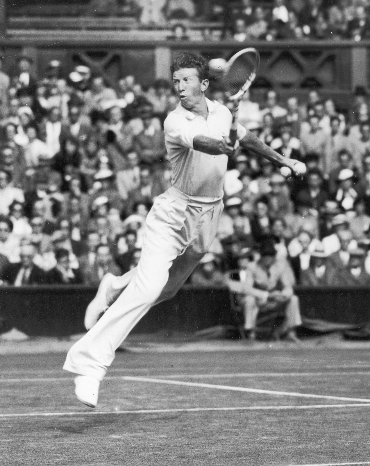 superimposed photo of Budge going for the ball seemingly in mid air takes up