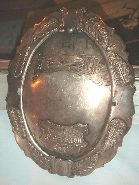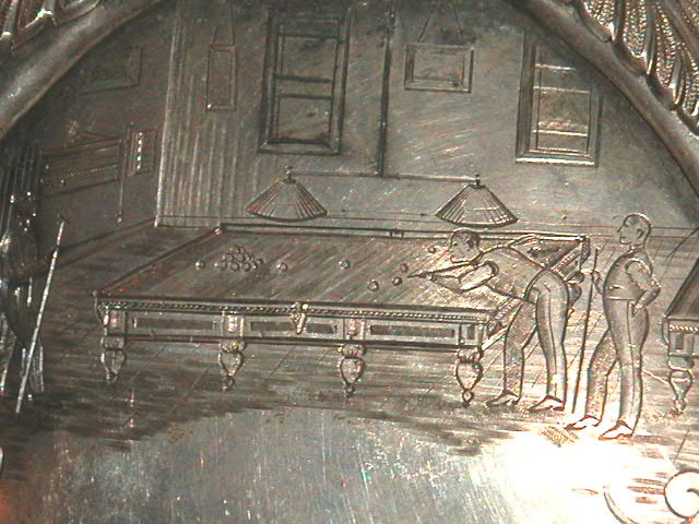 in shot) Appeared to have originally been attached to a backing of some sort, had an exceptionally detailed engraving of a billiards room scene. It was English, but still cool, very uncommon, good diversity for the show, nice piece, 8” tall by 6 Ľ” wide, $400.00